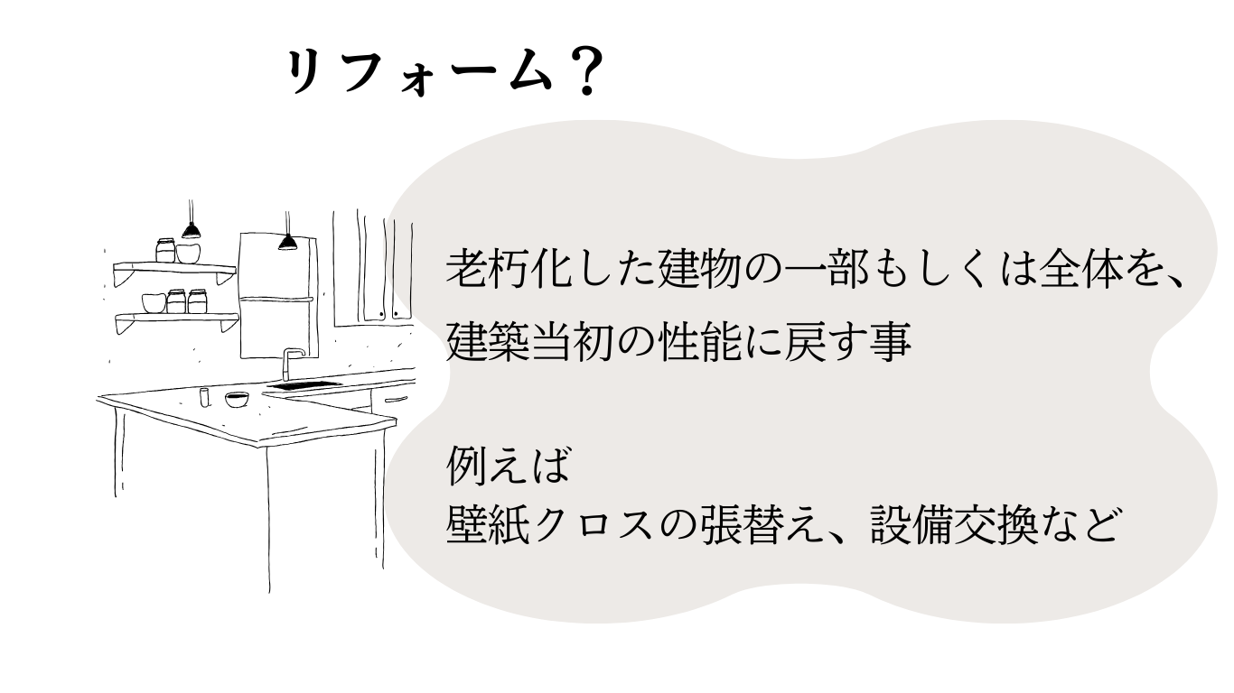 それに対し、ボロボロになった部分を修復する、老朽化したスペースを新しく改装する、といったケースを「リフォーム」と言います。リフォームはマイナスの部分を修復してプラスに戻すということです。