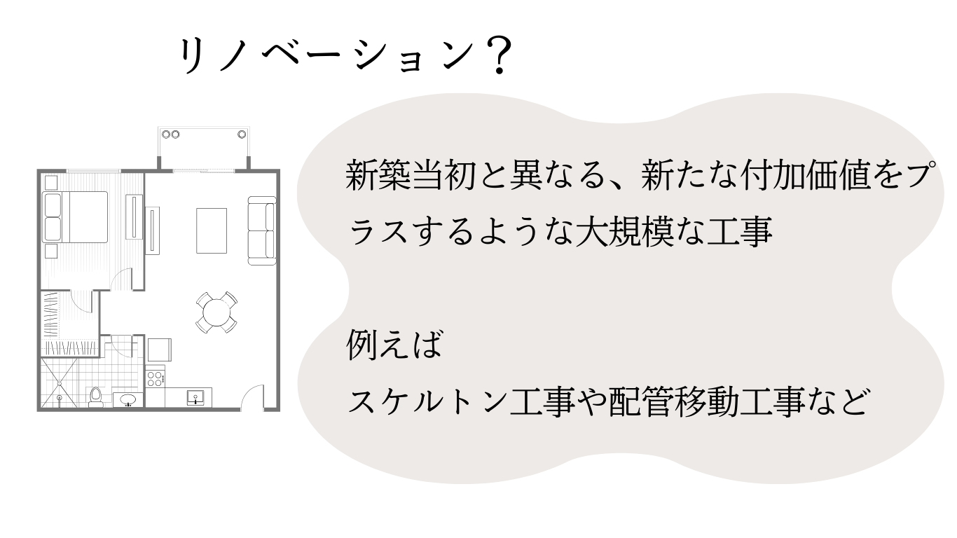 システムキッチンやユニットバスなどの設備の交換、クロス・床などの内装工事はリフォームです。それにたいして、間取り・排水管などの移動を伴う大規模な工事はリノベーションです。